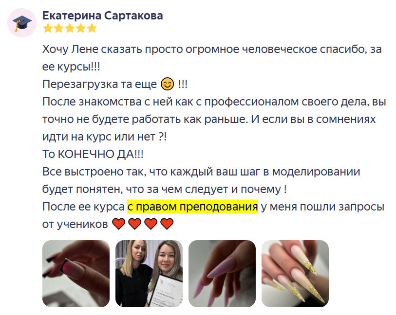 Обучение наращиванию ногтей с правом преподавания подойдет мастерам, которые хотят выйти на новый уровень в профессии и обучать других. Такой формат помогает не только глубже освоить технику моделирования, но и понять, как объяснять материал, видеть ошибки учениц и выстраивать обучение поэтапно. В школе Yagoda Nail можно пройти курс с правом преподавания на базе разных направлений: верхние формы, салонное моделирование, арочное моделирование и сложные формы. Если вы уже работаете мастером и хотите развиваться как преподаватель, можно выбрать подходящую программу и оставить заявку на подбор курса.